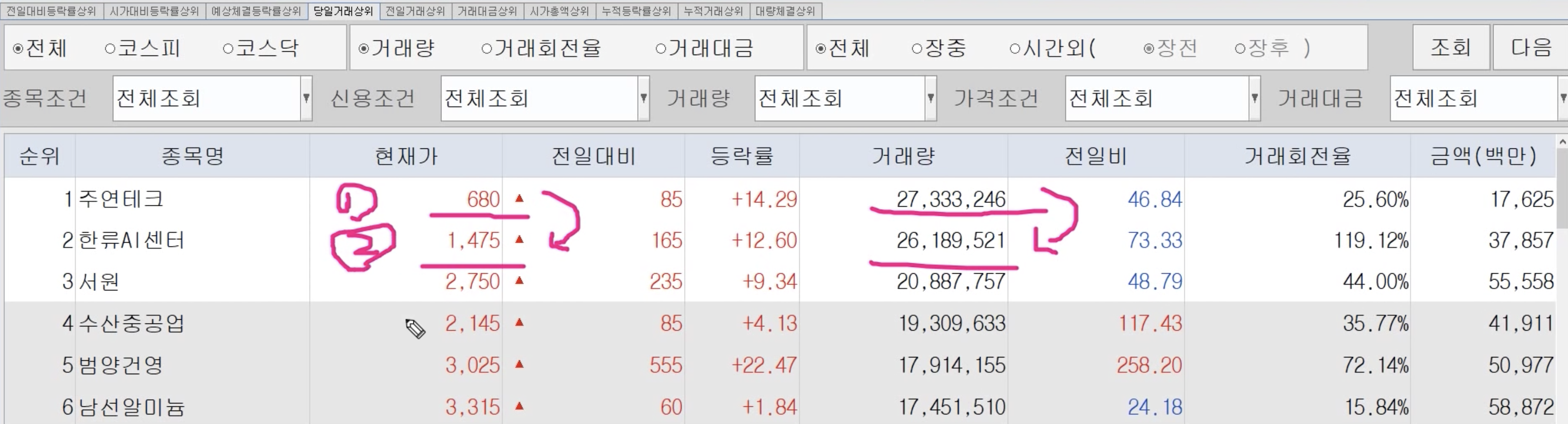 지금은 거래량 1순위를 보기 위해, 거래량 최상위 종목들을 보고 있다.