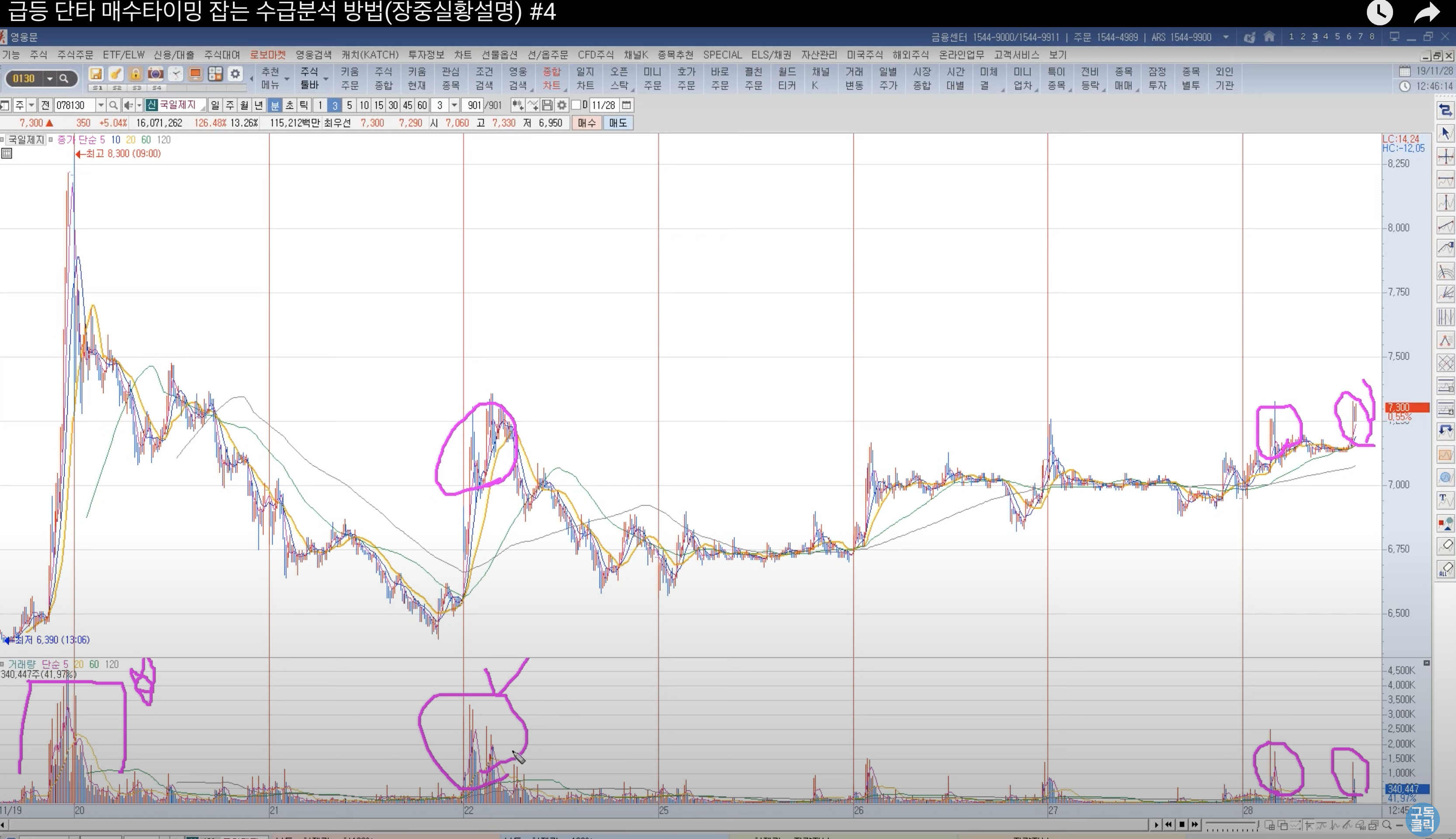 3분봉 화면에서 며칠전 급등 나왔을 때의 수급의 힘, 이후 파동 나올때 힘, 그리고 현재의 힘을 비교해봐야 한다.