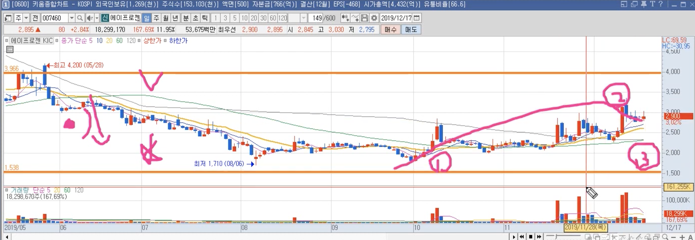 이번에 종목 고른것 처럼 거래량 상위로 찾게되면, 2번을 맞이하고 있는 차트를 볼 확률이 굉장히 높다.