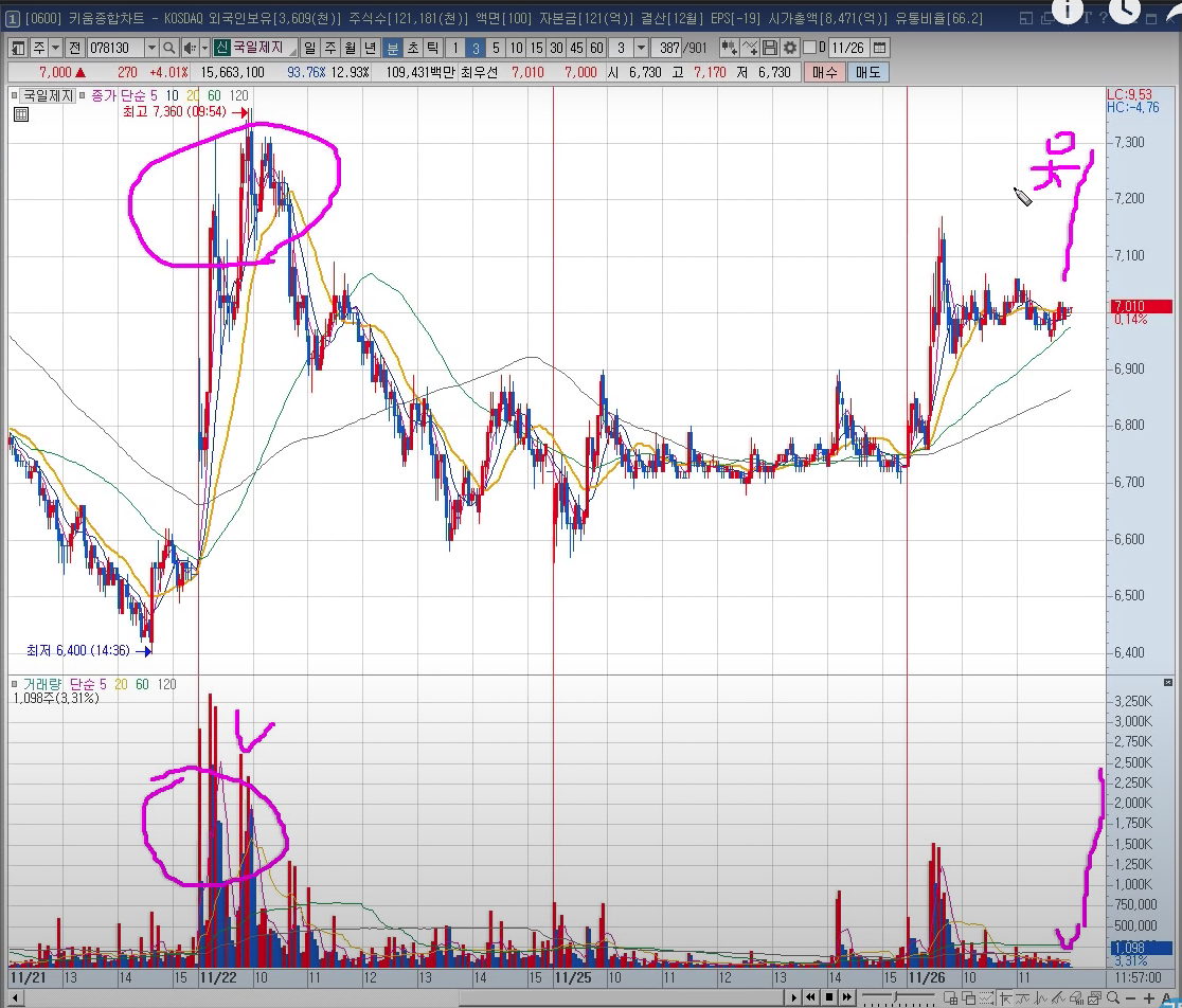 어니스트님이라면, 이후에 거래량이 11/22처럼 수급이 몰려올 것을 염두에 두고, 7,300원쯤에 대기를 하고 있겠다고 한다.