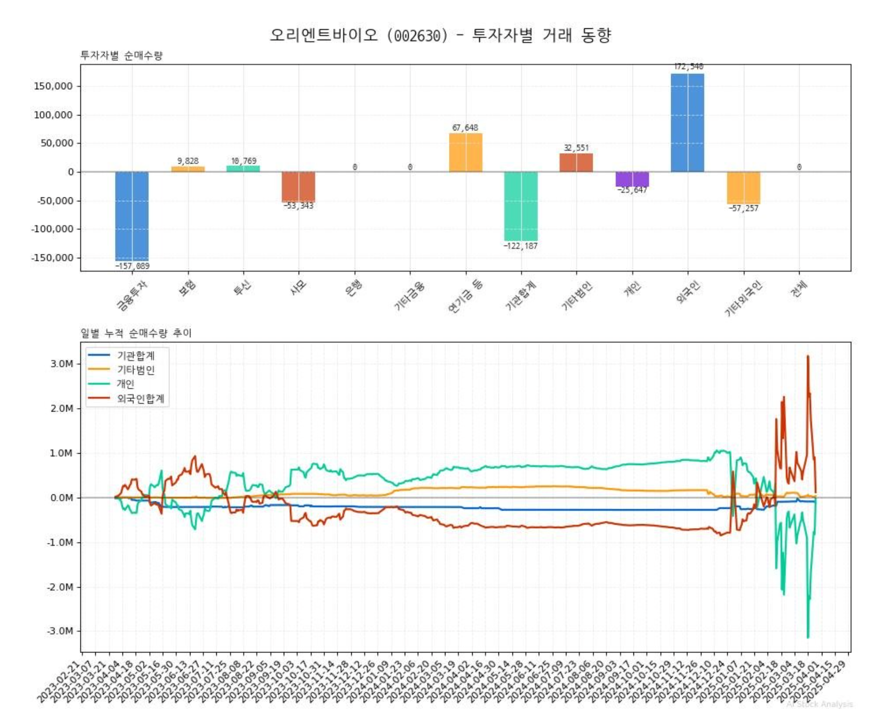 오리엔트바이오의 투자자별 거래 패턴 분석 결과, 다음과 같은 특징이 발견되었습니다: